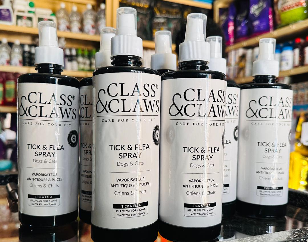 CLASS AND CLAWS Tick & Flea spray is a veterinarian-approved formula that eliminates fleas and ticks on contact, providing long-lasting